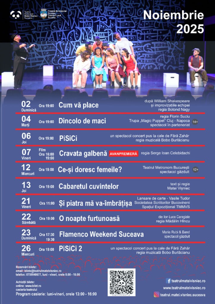Teatrul Municipal „Matei Vișniec” Suceava invită publicul la o lună plină de spectacole variate, de la comedii și drame la concerte și proiecții de film, în luna noiembrie 2025.