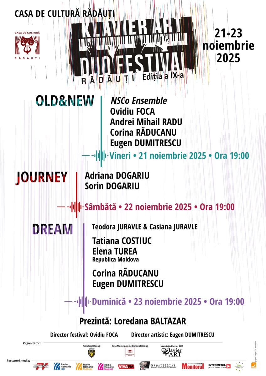 Unicul festival de pian la patru mâini din România, Klavier Art Duo Festival, ajunge la cea de-a noua ediție și se va desfășura în perioada 21-23 noiembrie 2025 la Casa de Cultură din Rădăuți.