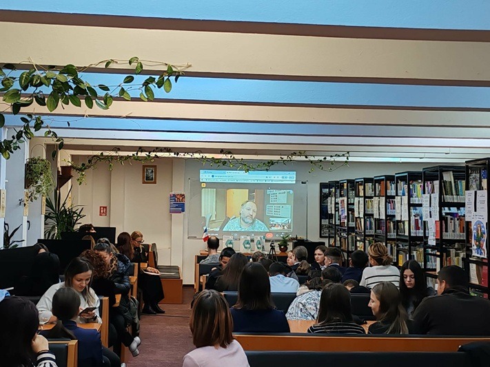 Un moment așteptat a fost intervenția online a lui Frédéric Castel, profesor la INSPE Reims și animatorul emisiunii „On allume les étoiles”, care a vorbit despre reflectarea actualității în muzica franceză contemporană și despre imaginea profesorului în cântece emblematice precum „Adieu Monsieur le Professeur” (Hugues Aufray).
