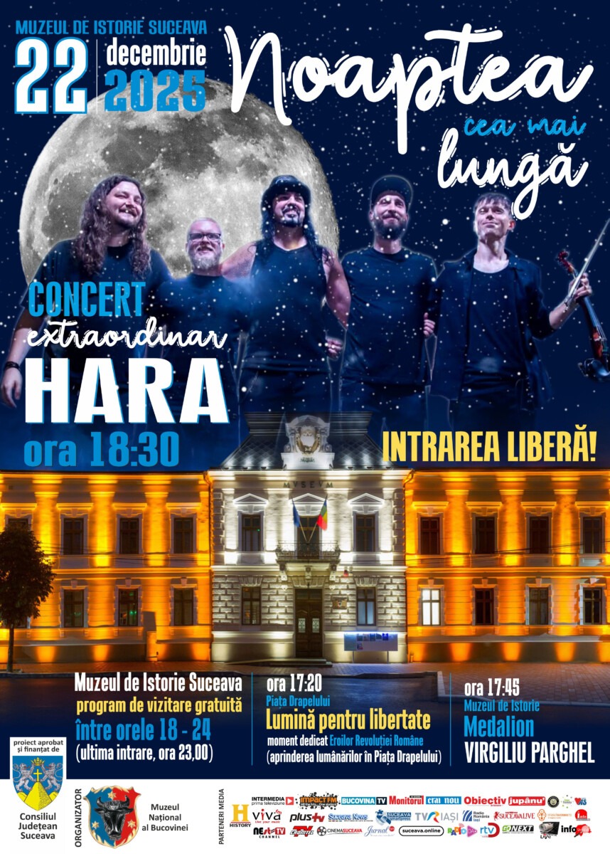 Muzeul Național al Bucovinei sărbătorește anul acesta a 20-a ediție a evenimentului „Noaptea cea mai lungă”, dedicat Solstițiului de iarnă. Pe 22 decembrie 2025, sucevenii sunt invitați la un program special cu momente artistice, colinde și vizită gratuită la Muzeul de Istorie între orele 18:00 – 24:00 (ultima intrare la 23:00).