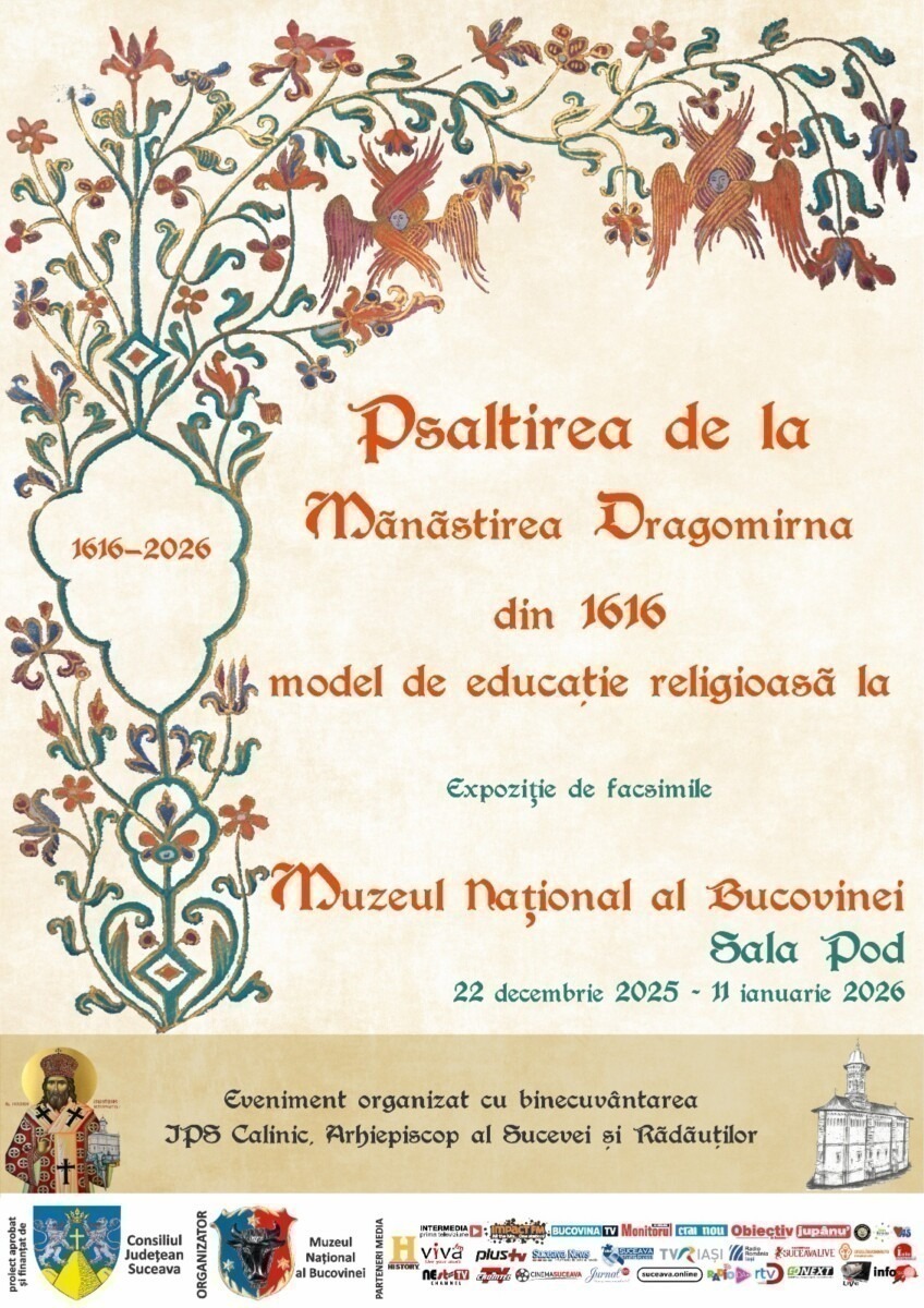 Muzeul Național al Bucovinei invită publicul, în perioada 22 decembrie 2025 – 11 ianuarie 2026, la expoziția de facsimile „Psaltirea de la Mănăstirea Dragomirna din 1616 – model de educație religioasă”, deschisă la Muzeul de Istorie, Sala POD.