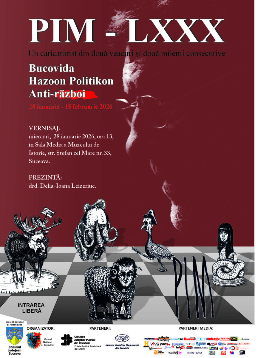 Muzeul Național al Bucovinei invită publicul sucevean și bucovinean la vernisajul expoziției aniversare „PIM – LXXX: un caricaturist din două veacuri şi două milenii: Bucovida, Hozoon Politikon, Anti-război.”, semnată de maestrul caricaturii românești Mihai Pânzaru-PIM. Evenimentul va avea loc miercuri, 28 ianuarie 2026, ora 13:00, în Sala Media a Muzeului de Istorie din Suceava (str. Ștefan cel Mare nr. 33), cu ocazia împlinirii vârstei de 80 de ani a artistului.