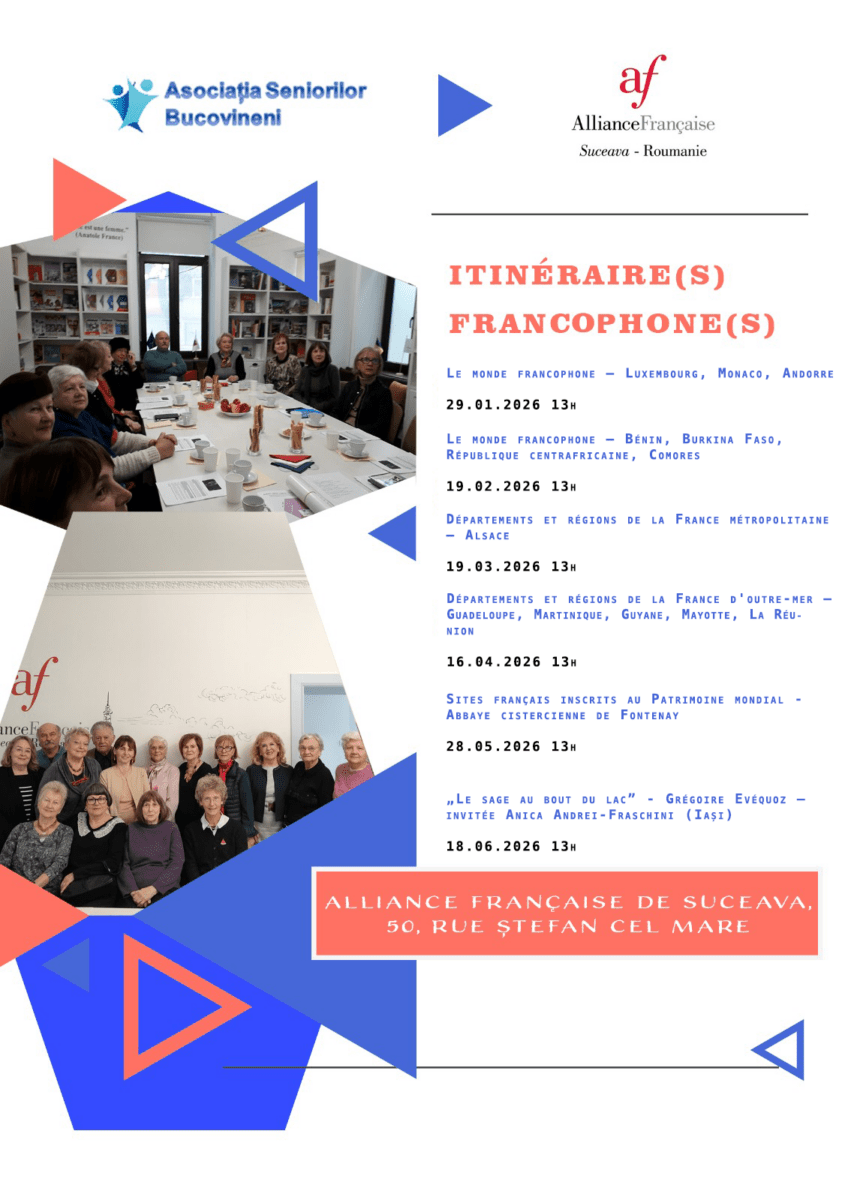 Joi, 29 ianuarie 2026, începând cu ora 13:00, Alianța Franceză din Suceava, în parteneriat cu Asociația Seniorilor Bucovineni, lansează oficial noul an de activități în cadrul proiectului Itinéraires francophones printr-o dezbatere dedicată spațiilor francofone Luxembourg, Monaco și Andorre.