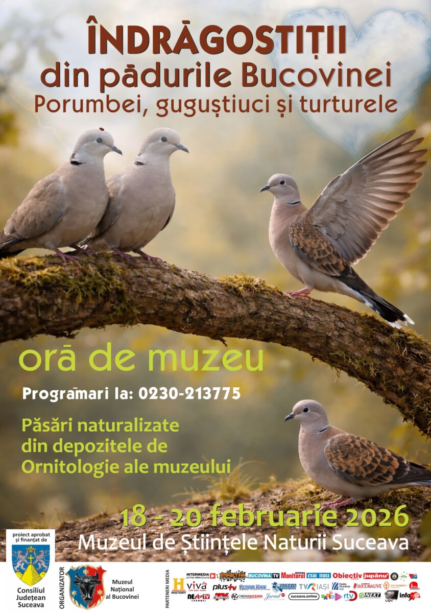 Muzeul Național al Bucovinei invită micii exploratori și familiile lor la o lecție interactivă și plină de farmec: „Îndrăgostiții din pădurile Bucovinei”, programată în perioada 18 – 20 februarie 2026, cu ocazia sărbătorii tradiționale Dragobetele. Activitatea se adresează preșcolarilor și elevilor din clasele primare și gimnaziale și promite o incursiune fascinantă în lumea păsărilor monogame din natură.