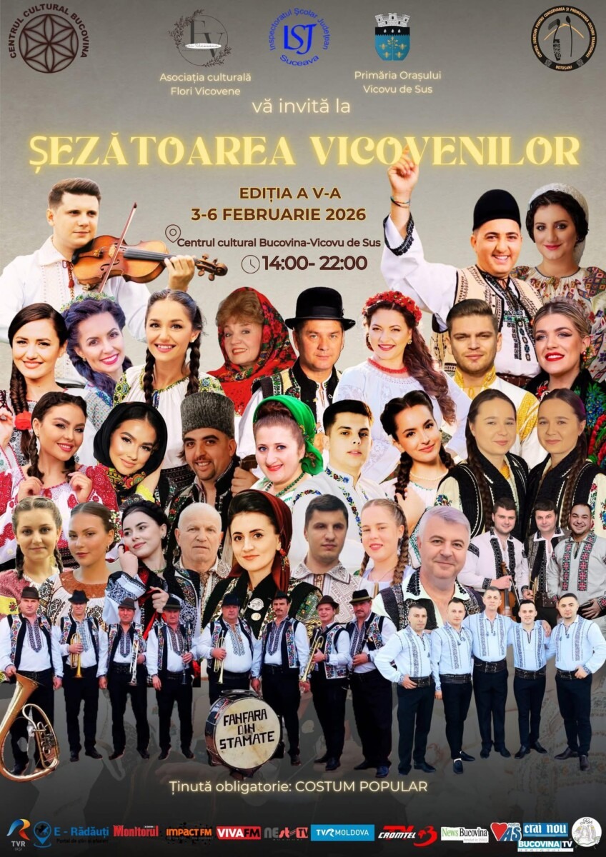 Cea de-a V-a ediție a Șezătorii Vicovenilor, eveniment cultural-educativ de referință pentru zona Bucovinei, va avea loc în perioada 3-6 februarie 2026 la Centrul Cultural Bucovina din Vicovu de Sus. Organizat de Asociația Culturală Flori Vicovene, în parteneriat cu Primăria Orașului Vicovu de Sus, Inspectoratul Școlar Județean Suceava și Centrul Cultural Bucovina, evenimentul readuce în prim-plan vechiul obicei al șezătorii – un spațiu autentic de întâlnire, lucru comun, cântec și transmitere a tradițiilor între generații.
