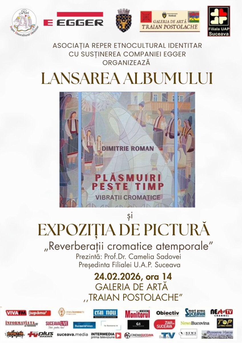 Marți, 24 februarie 2026, începând cu ora 14:00, la Galeria de Artă „Traian Postolache” din Rădăuți va avea loc lansarea albumului de pictură „Plăsmuiri peste timp. Vibrații cromatice”, semnat de artistul plastic Dimitrie Roman. Evenimentul va fi însoțit de vernisajul expoziției „Reverberații cromatice atemporale”, care oferă publicului o incursiune în creația plastică a pictorului.