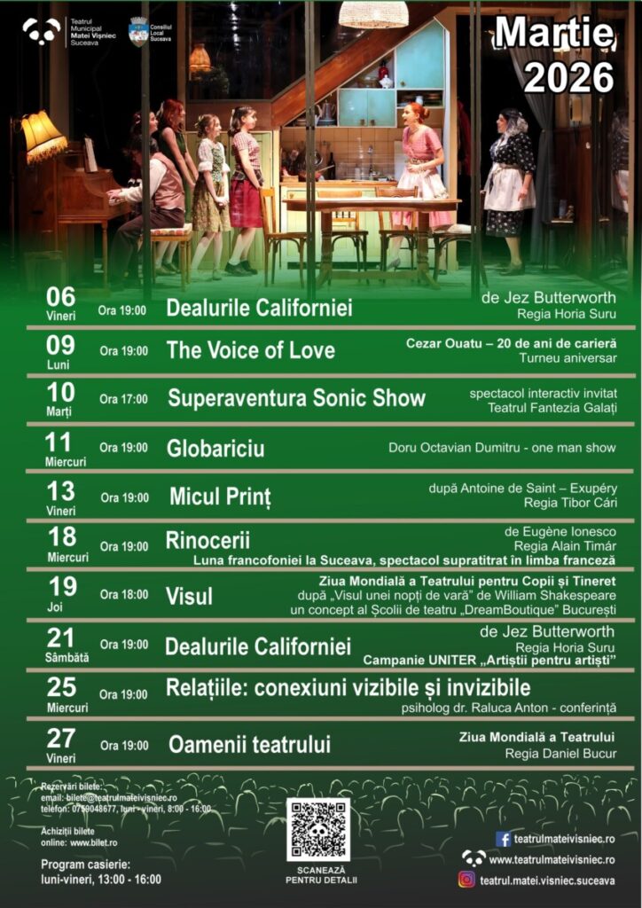 Teatrul Municipal „Matei Vișniec” Suceava anunță un program divers și de calitate pentru luna martie 2026, cu premiere naționale, spectacole invitate, evenimente aniversare și reprezentații dedicate unor zile mondiale importante. Iată calendarul principal al lunii:
