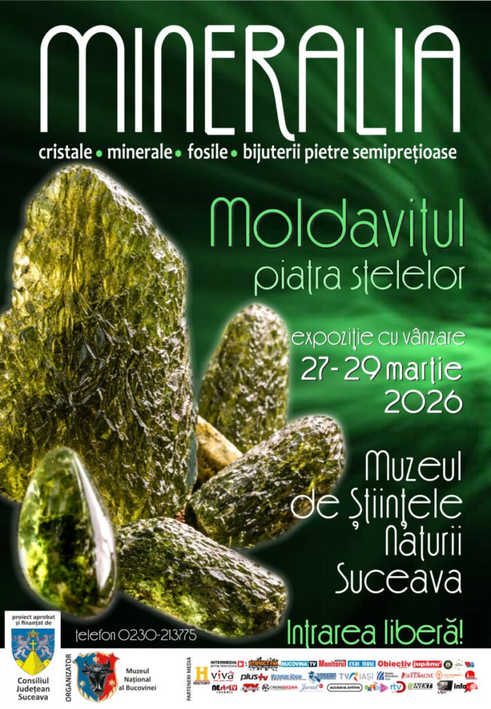 Muzeul de Științele Naturii din Suceava găzduiește, în perioada 27–29 martie 2026, ediția de primăvară a expoziției MINERALIA – LUMEA CRISTALELOR ȘI MINERALELOR DE COLECȚIE, un eveniment tradițional al Muzeului Național al Bucovinei care atrage anual pasionați de mineralogie, geologie și bijuterii naturale.
