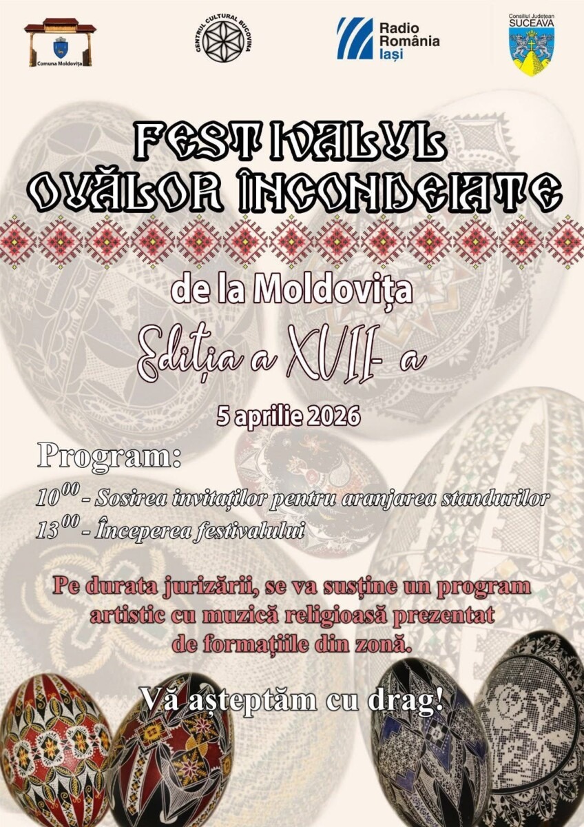 Comuna Moldovița va găzdui, duminică, 5 aprilie 2026, cea de-a XVII-a ediție a Festivalului Ouălor Încondeiate, un eveniment emblematic pentru tradițiile culturale huțule din Bucovina.