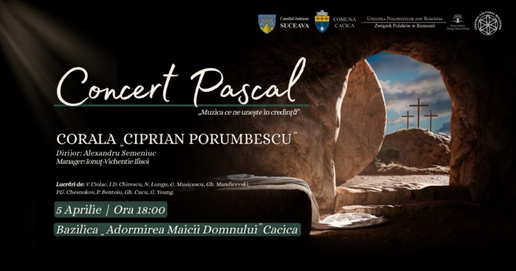 Consiliul Județean Suceava, prin Centrul Cultural „Bucovina”, în parteneriat cu Primăria Comunei Cacica, Uniunea Polonezilor din România și Asociația „Sing Bucovina”, organizează duminică, 5 aprilie 2026, un concert pascal de excepție în cadrul proiectului cultural „Paștele în Bucovina”.