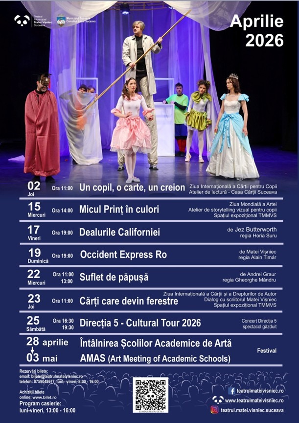 Teatrul Municipal „Matei Vișniec” Suceava a anunțat programul complet pentru luna aprilie 2026, o lună bogată în spectacole de calitate, evenimente dedicate copiilor, întâlniri cu publicul, festival al școlilor academice de artă și concerte care vor anima scena suceveană.