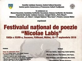 Festivalul naţional de poezie „Nicolae Labiş”, la Suceava, Fălticeni și Mălini, în zilele de 16 și 17 septembrie