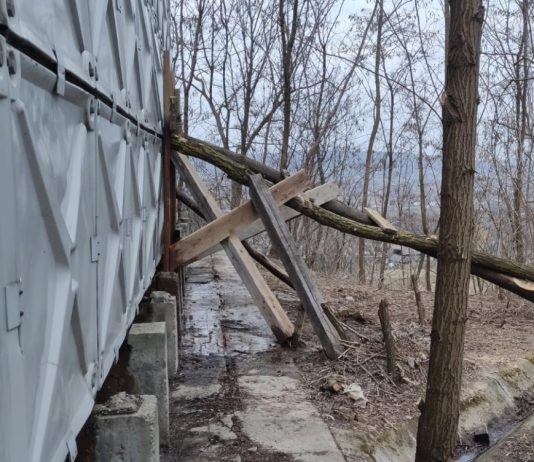 VIDEO//Bazinul de alimentare cu apă a orașului Dolhasca, proptit cu doi copaci ca să nu se reverse