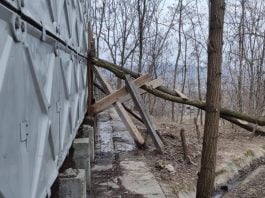 VIDEO//Bazinul de alimentare cu apă a orașului Dolhasca, proptit cu doi copaci ca să nu se reverse