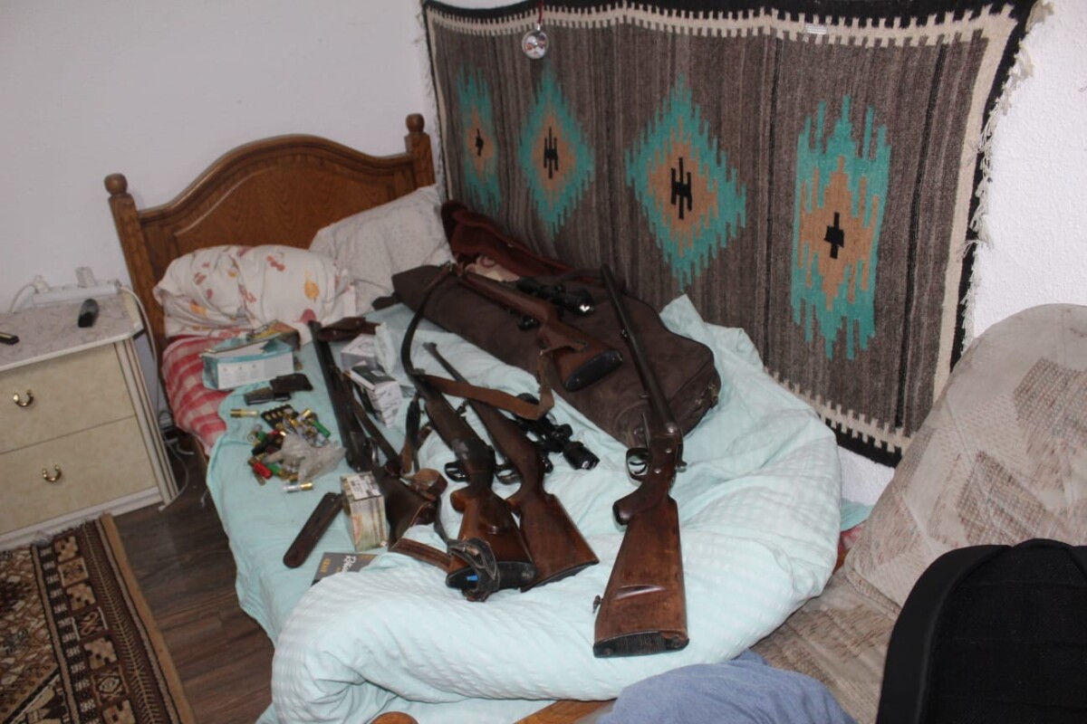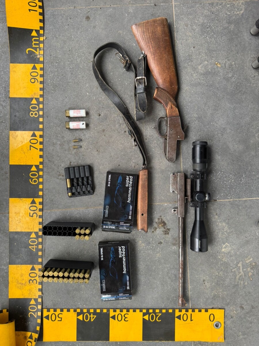 - O armă cu lunetă și cartuș pe țeavă, ținută ascunsă într-o anexă