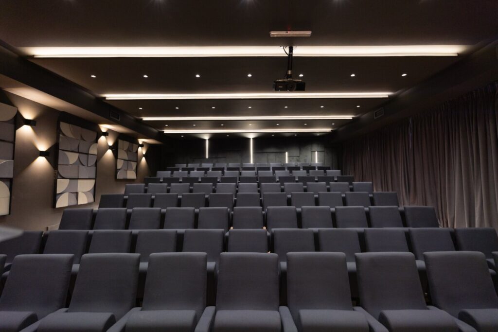 Procesul de modernizare a vizat fiecare element esențial pentru buna funcționare a unui spațiu dedicat culturii și evenimentelor educaționale. Pardoseala a fost înlocuită integral, cu sprijinul EGGER, pentru a asigura stabilitate. Finisajele pereților au fost refăcute complet și pregătite pentru integrarea elementelor acustice. Instalațiile electrice și cele destinate climatizării au fost reconfigurate pentru a permite utilizarea sălii în regim intens.