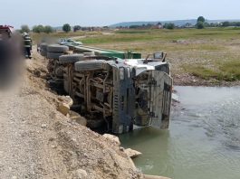 Doi răniți după ce un autocamion s-a răsturnat de pe podul provizoriu de la Slobozia Sucevei