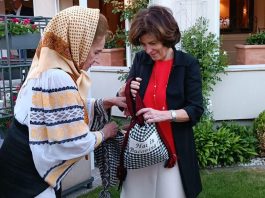 Ambasadoarea Franței în România a învățat de la Sofia Vicoveanca cum se poartă traista tradițională bucovineană