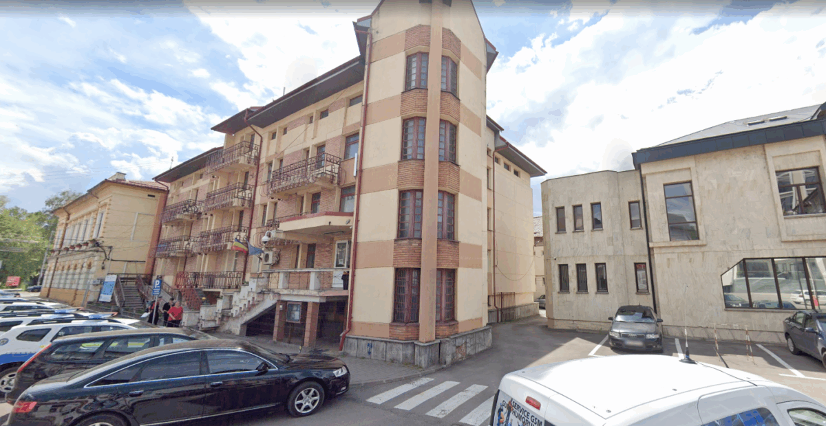 Vehiculul a oprit în parcarea special amenajată din spatele sediului Poliției Orașului Gura Humorului.