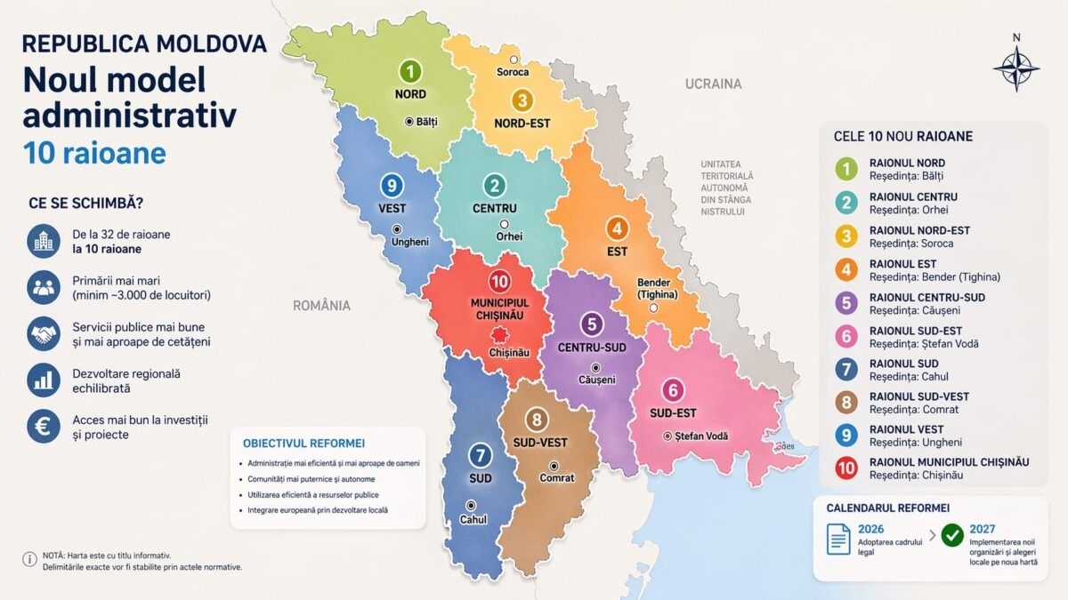 Republica Moldova a luat o decizie curajoasă și necesară: începe o reformă administrativă reală și consistentă. Țara vecină va trece de la actualul model cu 32 de raioane la doar 10 raioane, reducând drastic numărul de structuri administrative intermediare. Totodată, la nivel local, se va realiza o comasare a primăriilor, stabilindu-se un prag minim de 3.000 de locuitori pentru o comună.