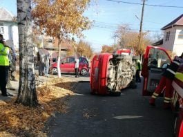 FOTO // Rădăuți: Autoturism răsturnat în urma unui accident rutier. Două persoane au ajuns la spital