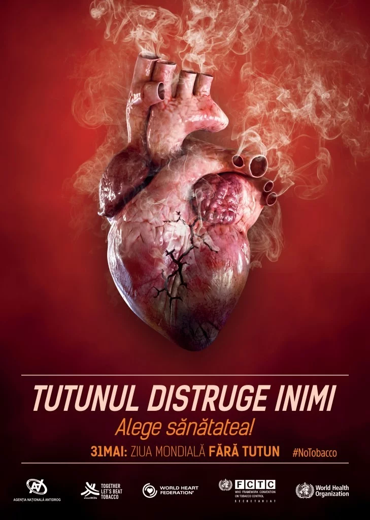 „Ziua Mondială fără Tutun 2018 coincide cu o serie de iniţiative globale şi oportunităţi care vizează epidemia tutunului, astfel că în acest an, campania va evidenţia impactul pe care îl are consumul de tutun asupra sănătăţii cardiovasculare a oamenilor din toată lumea. Consumul de tutun este un factor de risc important pentru dezvoltarea bolilor de inimă coronariene, a infarctului şi a bolilor vasculare periferice.