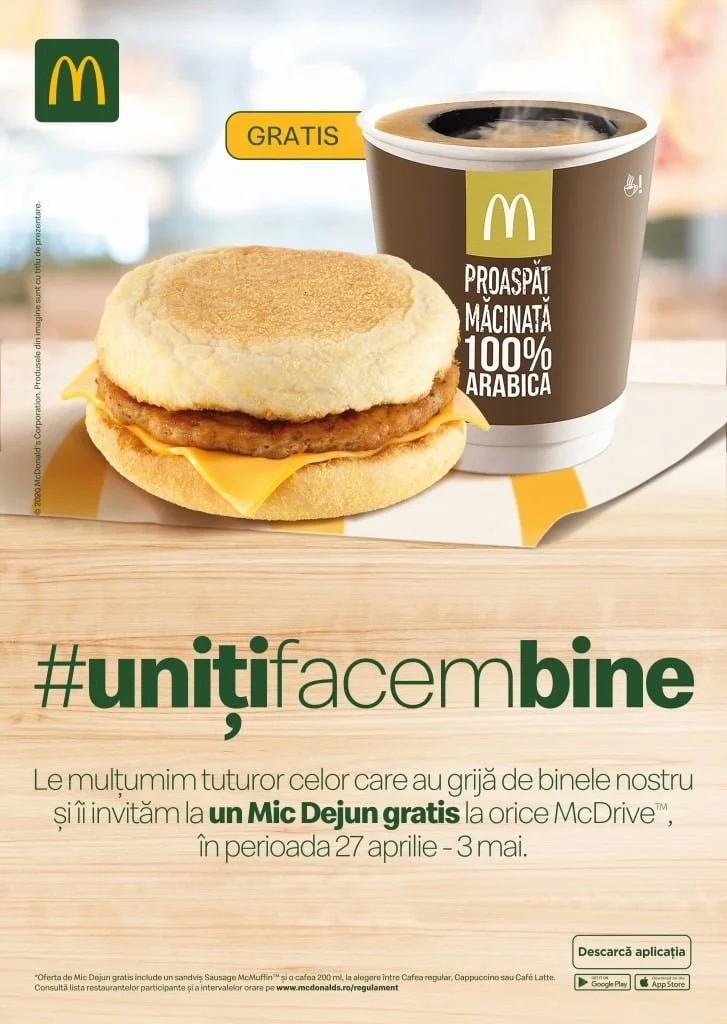 McDonald’s rămâne aproape de comunitate și le mulțumește tuturor celor care țin România în mișcare în această perioadă fără precedent. Pentru că numai #unițifacembine, toți cei care sunt nevoiți să iasă din casele lor de la primele ore ale dimineții, pentru a asigura bunul mers al vieții, pot beneficia de câte un mic dejun din partea casei oferit de McDonald’s în perioada 27 aprilie – 3 mai.