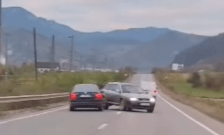 În imagini, un autoturism este surprins circulând pe DN 17, între localitatea Prisaca Dornei și municipiul Câmpulung Moldovenesc, în direcția Vatra Dornei, fiind la un pas de a intra în coliziune cu un alt vehicul care se deplasa pe sens opus.