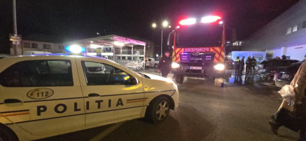 La fața locului, angajatul firmei de pază a relatat că a observat fum gros ieșind de sub capota unui Volkswagen Golf, sugerând arderea unor componente.