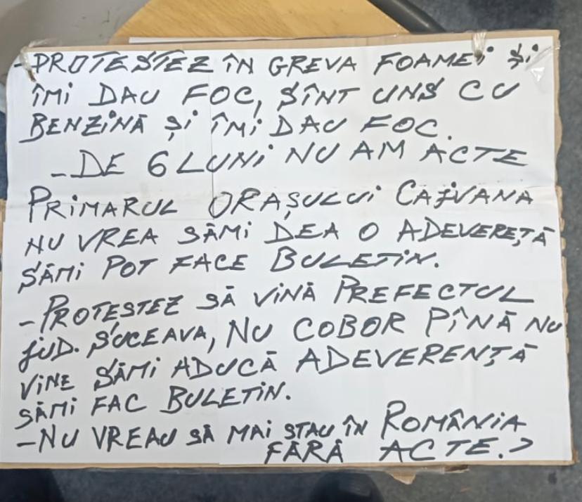 „PROTESTEZ ÎN GREVA FOAMEI ȘI ÎMI DAU FOC, SUNT UNS CU BENZINĂ ȘI ÎMI DAU FOC. DE 6 LUNI NU AM ACTE. PRIMARUL ORAȘULUI CAJVANA NU VREA SĂ-MI DEA O ADEVERINȚĂ SĂ-MI POT FACE BULETIN. PROTESEZ SĂ VINĂ PREFECTUL JUD. SUCEAVA, NU COBOR PÂNĂ NU VINE SĂ-MI ADUCĂ ADEVERINȚA SĂ-MI FAC BULETIN. NU VREAU SĂ MAI STAU ÎN ROMÂNIA FĂRĂ ACTE.”