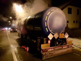 FOTO // Un autotren cu semiremorcă încărcată cu bitum a luat foc din mers pe raza municipiului Câmpulung Moldovenesc