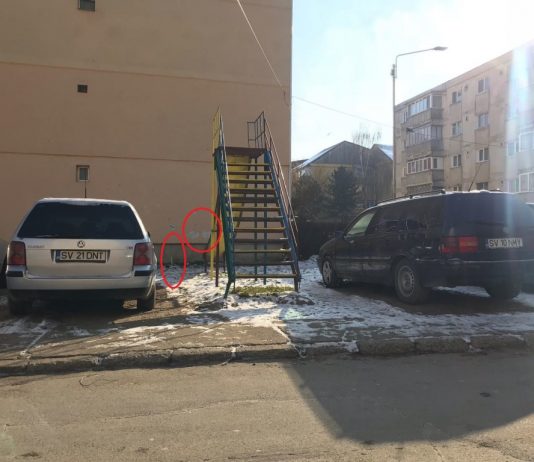 Tobogan, amplasat între mașini, ce se oprește în peretele unui bloc din Burdujeni lângă o țeavă de gaz metan. Cușnir: E un exemplu al...