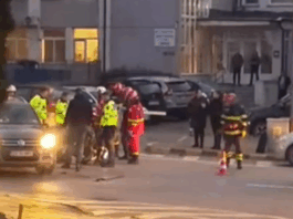 Exercitiu al pompierilor in caz de incendiu, la Palatul de Justitie