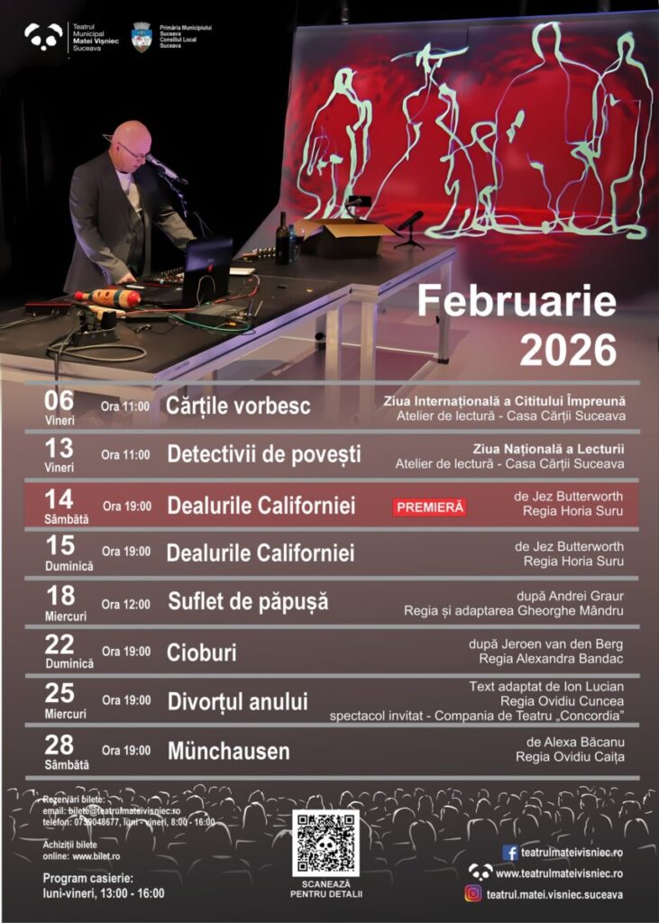 Teatrul Municipal „Matei Vișniec” Suceava anunță programul complet al lunii februarie 2026, care aduce atât evenimente dedicate copiilor, spectacole de teatru contemporan, cât și montări clasice reinterpretate. Luna începe cu ateliere de lectură dedicate Zilei Internaționale a Cititului Împreună și Zilei Naționale a Lecturii, continuă cu premiera națională a piesei „Dealurile Californiei” și include spectacole pentru publicul tânăr și adult, printre care „Cioburi”, „Divorțul anului” și monodramă „Münchausen”.