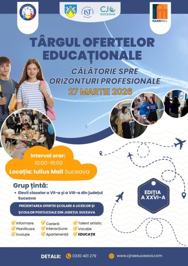 Vineri, 27 martie 2026, între orele 10:00 și 16:00, Centrul Județean de Resurse și Asistență Educațională (CJRAE) Suceava organizează, la Iulius Mall Suceava (Calea Unirii nr. 22), ediția a XXVI-a a Târgului Ofertelor Educaționale – Călătorie spre orizonturi profesionale. Evenimentul se adresează în mod special elevilor claselor a VIII-a și părinților acestora, oferind o platformă completă de informare privind opțiunile de continuare a studiilor în învățământul liceal și postliceal.