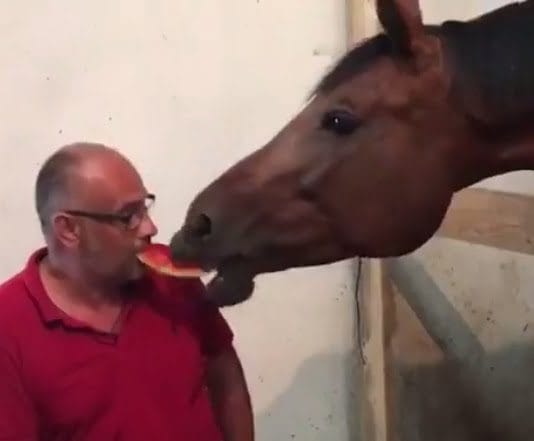 VIDEO Vicepreședintele ALDE, deputatul Alexandru Băișanu, un mod inedit de a oferi pepene roșu calului preferat